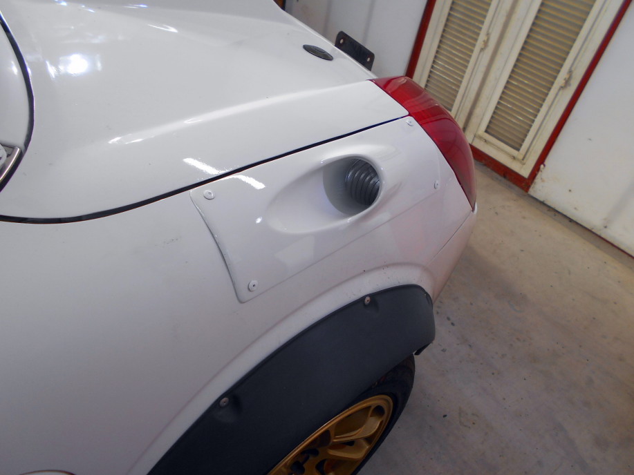 | MR-Sのルーフエアインテークがエンジンフードを変更した事により使えなくなってしまったので、しばらく前から代案を考えていましたが、やっと考えがまとまったので作業に取り掛かることにしました。 今度はリアフェンダーの上部から吸入させる方法を取ります。 今回は久しぶりにメス型を作るので最初にボディのベース型を取ります。 必要範囲にマスキングテープを貼り、その上にアルミテープを貼ってからガラスマットを3プライ程度積層して硬化させます。 |