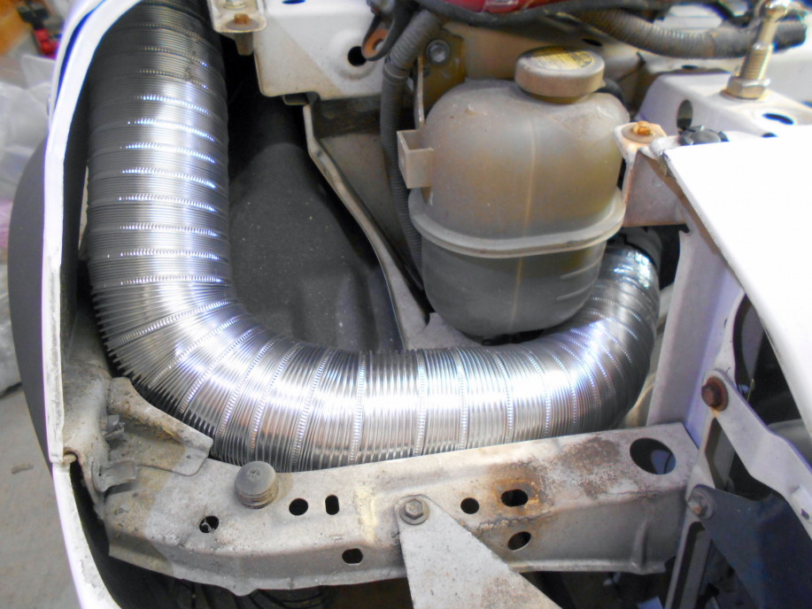 | 75Φのアルミジャバラパイプでインテークダクトとエアクリーナーケースを接続して完成。 以前のルーフエアインテークほどではないかもしれませんがこれでしっかり外気をエンジンに送り込むこ事が出来そうです。 |