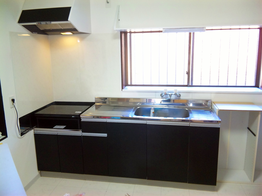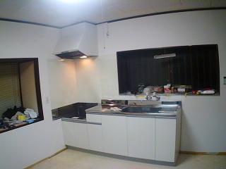 | 壁紙が貼り終ったので設備品の設置。 新品のレンジフードと流し台、コンロ台を据付けます。 レンジフードはランプ付きで気に入っているのですが、流し台は一番安いのを購入したのでなんか安っぽい・・・。いや、安いから当然ですが(笑) コンロ台の周りにはセラリエX(エックス)という不燃化粧板を貼りました。 これは名前がカッコイイと思ったのと、見た目が石目調で高級っぽかったから(笑) 実際、値段もちょっと高かったので沢山は買えず、下の方はステンレス板で誤魔化してしまいました(^^;) |