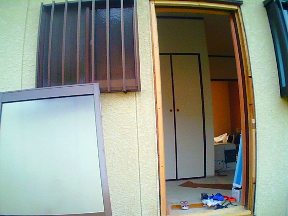 | 昭和の家なので(?)キッチンにはいわゆる「お勝手口」がありましたが、 必要がない上、防犯上も断熱上もよろしくないので撤去する事に。 ドアを取り外し、サッシも取り外します。 |