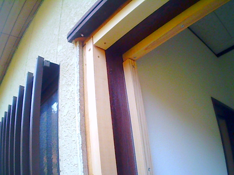 | 残った木の枠に適当な幅の角材をビスで打ちつけます。 塞ぐ板は外と中の2枚貼るので角材も外と中に。 コンパネの厚みを計算に入れ、外も中もツライチになるように位置出ししてあります。 |