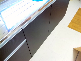 | ←カーボンシールです(笑) 全くの平面なのでとても簡単に貼る事ができました。 無駄に艶が無いので落ち着いた印象になったかな? ついでにレンジフードの一部にも貼っています。 |