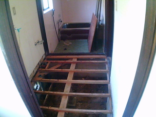 | 入居したのは12月終りの頃。 この辺りでは寒い方の地域ではありますが、にしてもやけに床下から冷えるので床下に入り点検することに。 入り口が特に見当たらなかったのでリビングの隣の和室の押入れの床を壊して侵入する事にします。 バールとハンマーでバリバリと板を剥がし、床柱も取り除きます。 |