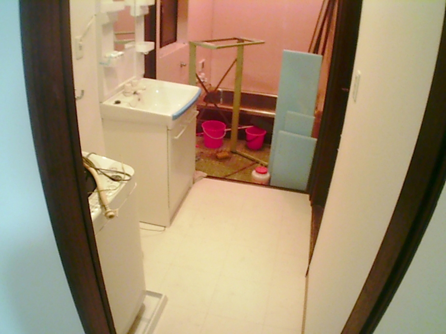 | 床板の上にクッションフロアを接着し、新しい壁紙を貼ります。 新品の洗面化粧台を設置し水道配管も新規に接続しました。 |