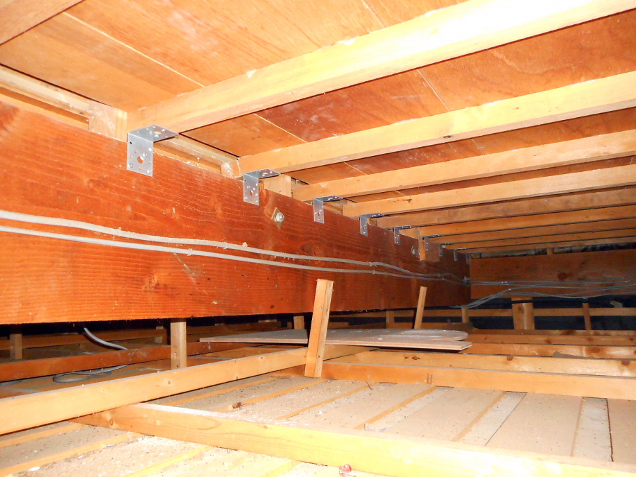 | 早速天井裏に入り込み点検してみると、 床板を支えている横柱がもともとクサビ等で適当に(?)調整されていたようで、それが地震の影響等で取れてしまっていたり変形したりしていて、その分が床板の下がりとなっていたようです。 床板の水平を見てもらいながら、ジャッキやバールで持ち上げて金具で固定しておきました。 |