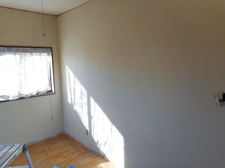 | 床が直ったので今度は壁。 ←は既にきれいになっていますが、これはパテ仕上げ後の画像。 古い壁紙を剥がしたところ、きれいに剥がれずに裏紙が汚く残ってしまい、それを取り除く為にスクレーパー等でゴリゴリ剥がしたら壁が傷だらけになってしまいました。 やむなく六畳間の壁「全面」パテ塗り。 |