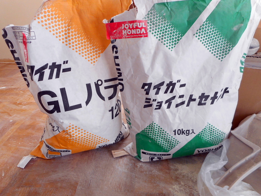 | 当然パテが大量に要るわけで・・・。 ←プロ用の10kg袋2セットを丸々使用。 左が下塗り用のパテ、右がペイント仕上げ用の上塗りパテ。 さすがプロ用、作業性が良く使い易いので今後マスター型造りにも使用してみようかな。 |
