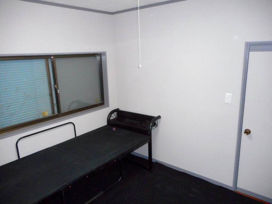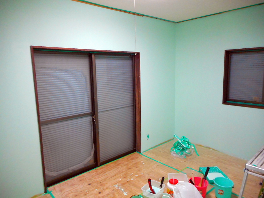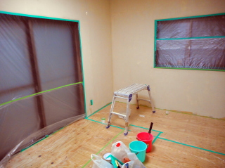 | さて今度は壁の塗装です。 床、窓枠、ガラス等、必要な場所をマスキング。 |