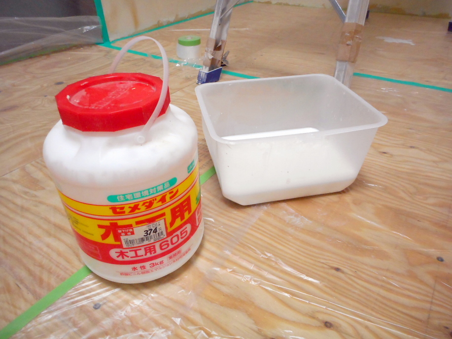 | ペンキを塗る前にここで本来下塗り用シーラーを塗るのですが、 ←木工用ボンドで代用します。 木工用ボンドを水で7〜8倍程度に薄めてローラーで塗ります。 1回塗ったら翌日まで乾かし、翌日再度塗ってまた乾かします。 壁の表面がツルっとしていればオッケーでしょう。 |