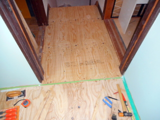 | 階段を上がりきったところの床板にも同じように合板を重ねて高さを合わせます。 部屋の床板と繋がるようにして敷居を撤去した穴を塞いでしまいます。 |