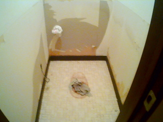 | 新しい便器が届いたので早速作業開始。 水道の元栓を止め、給水管を取り外し、便器と給水タンク内の水を抜き取れば、あとは床に止めてあるネジを何本か外すだけだったのですぐに取り外せました。 ←便器を撤去したところ。 なんか「汚物」とか出てきそうで恐る恐るの撤去作業でしたが、なんてことはなく、塩ビの配管がそこにあるだけ。 我が家は浄化槽なので多少は臭いましたけど。 |