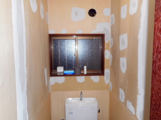 | なぜかこの家のトイレには換気扇が設置されていなかったので追加で換気扇の取り付け、壁と床の状態も悪かったのでそちらも手直しします。 床には新しいクッションフロアを貼り、壁紙は全て剥がしました。 壁紙はまたしても綺麗に剥がれなかったので、上から3mm厚のベニヤ板を貼り付けて壁紙用の下地としました。 板の合わせ目とビス打ちした箇所はパテで均します。 |