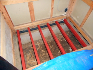 | 床下の作業が一段落したので、侵入口に使用した押入れの床を塞ぎます。 この押入れスペースは主に車のパーツ類の保管に使うので、通常の床板では重さに耐え切れない恐れがある為にかなり頑丈に作る必要があります。 そこでまずは鉄の角パイプ(75mmx45mmt=2.3)とL字アングルを溶接して製作したフレームを住宅基礎部分にかかるようにしっかりと固定。 |
