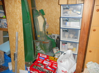 | 壁にはOSB合板をビス留めしておわり。 早速メス型やら部品、工具類を押し込んでみました。 総重量は100kgを軽く超えますが、剛性たっぷりの床板はびくともしません(笑) |