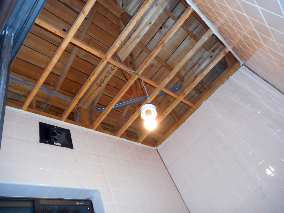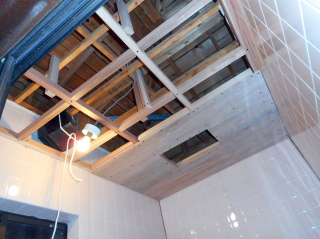 | 高い天井を300mm程度下げることにします。 木材で骨組みを作り、希望の位置に固定、天井板は耐水ベニヤ5.5mmをビス留め。 今までの換気扇は壁面に付くタイプだったので、この天井位置だと使用できなくなります。 なので天井に取り付けるタイプの換気扇に変更するわけですが、カミさんのたっての希望により「浴室換気乾燥暖房機」を取り付けることになりました。 購入した暖房機に合わせて天井に開口しておきます。 |