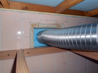 | 合板にステンレスフードを取り付けた後、室内側からアルミダクトを突っ込み、 断熱と保温の為スタイロフォーム40mm厚を2枚重ねて隙間を塞いであります。 |