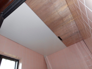 | パネルを全部貼り付け終わったので、あらかじめ採寸、切断してあった天井材を貼り付けます。 このパネルはフローリング床みたいに片側が嵌め込みになっていて、片側でビス留めして取り付けます。 |