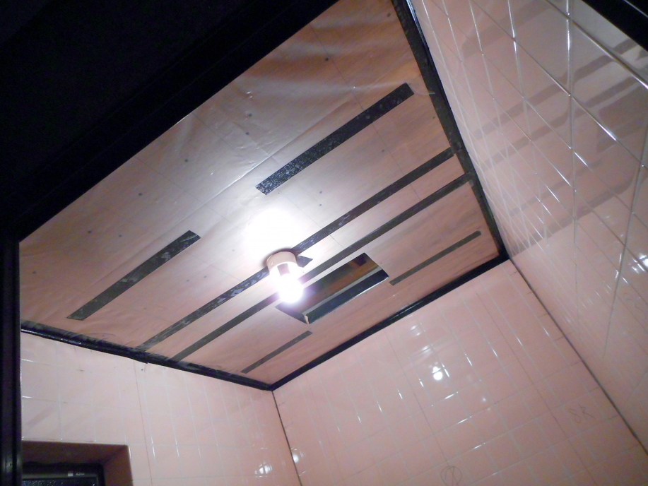 | 壁と天井板、天井板の合わせ目に「防水防湿両面テープ」を目張りして天井裏に湿気が上がるのを防ぎます。 さらに「防湿シート」なるビニールシートを天井全面に貼り付けます。 |