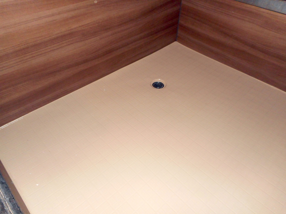 | 最後に床。 東リの「バスナフローレ」 浴室用のクッションフロアのようなもので、床の冷たさや硬さを低減してくれるそうです。 貼り方はほぼクッションフロアと同じ。 ウチはタイル床だったので、専用のパテで目地を埋めてからこれまた専用の二液混合の接着剤で床に貼り付けます。 |