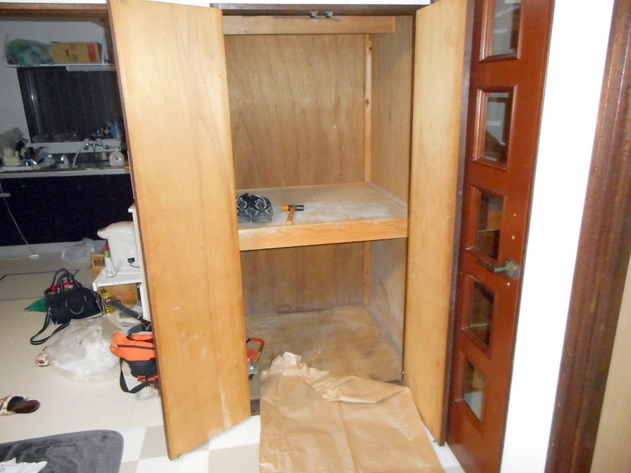 | バールや「キック」でとにかく破壊。 実はこの物入れ、反対側のキッチンにも向かい合わせで設置してあり、真ん中を薄い壁で仕切ってありましたが、とりあえずぶっ壊し、貫通しました。 |