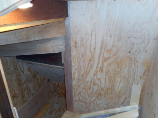 | 使い勝手を考えると、やはり真ん中は壁で仕切った方が良い気がしたので、構造用合板で壁を設置しました。 元々あったベニヤの壁よりだいぶ丈夫なので、棚板とかの取り付けには不自由しないと思います。 画像左下には既に床下点検口を作って蓋をしてあります。 |