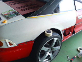| 以前リアフェンダーを作ったときはボディに直接離型処理をしてFRPを貼り込んでいましたが、今回はより離型し易くする為の処理をしてから貼り込む事にします。 まず必要な面積にマスキングテープを貼ります。 いきなりアルミテープでもいいのですが、剥がした後に糊がものすごく残ってしまい、その糊を落とす作業がかなり面倒なので粘着力の弱いマスキングテープを先に貼っておきます。 |