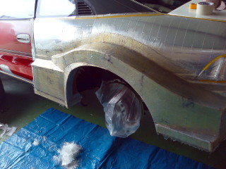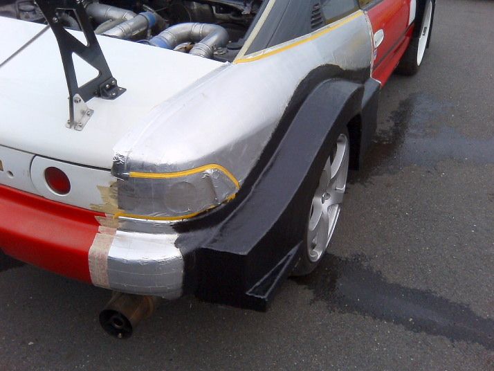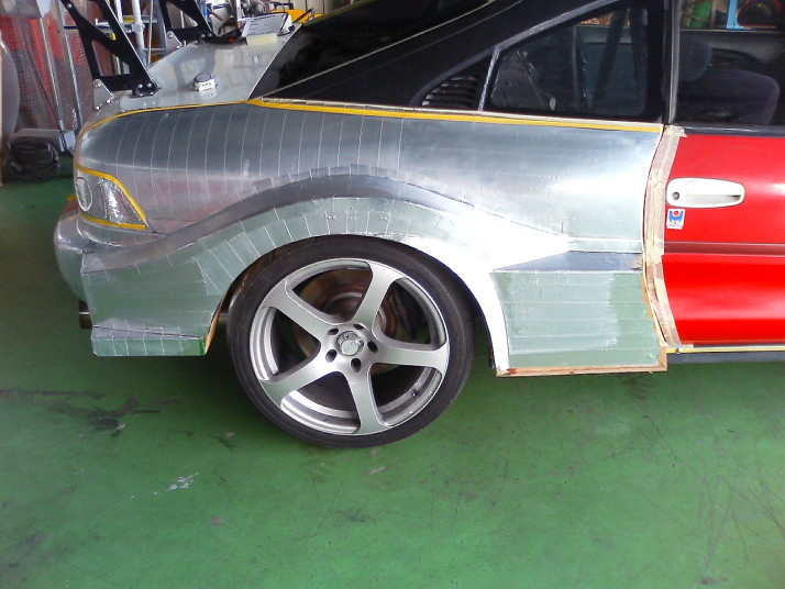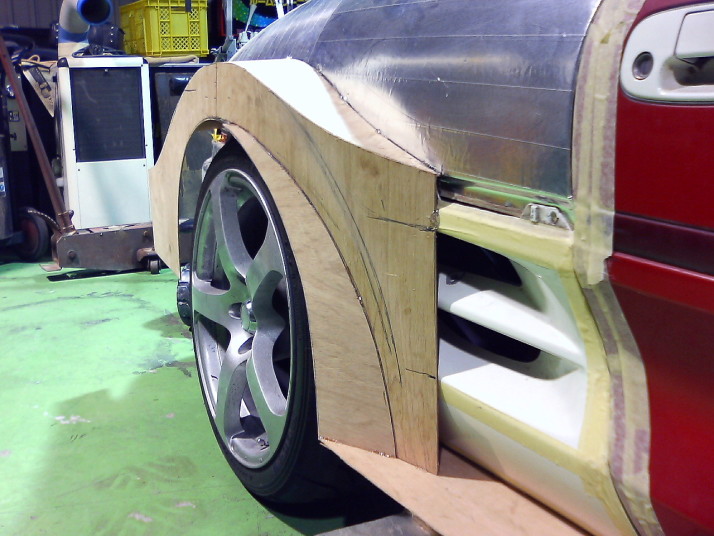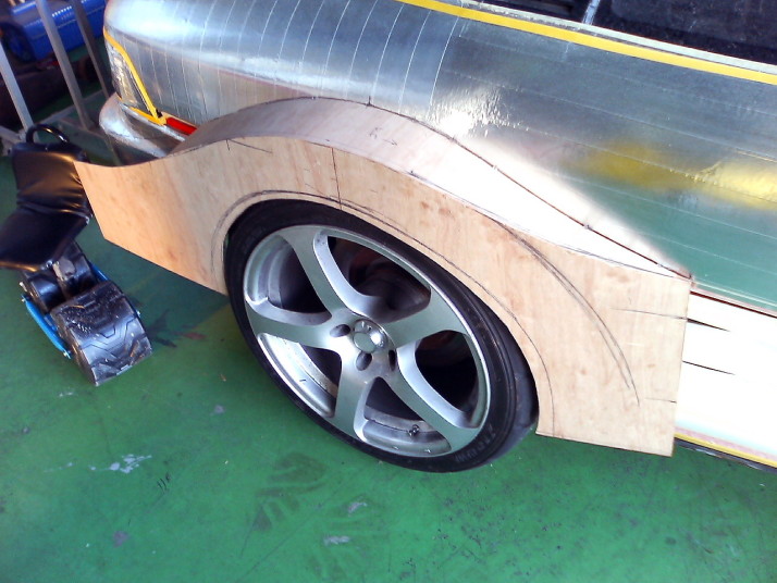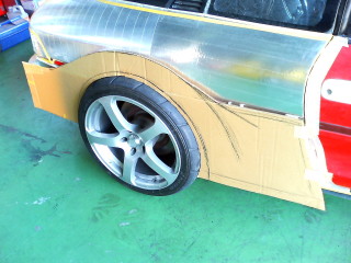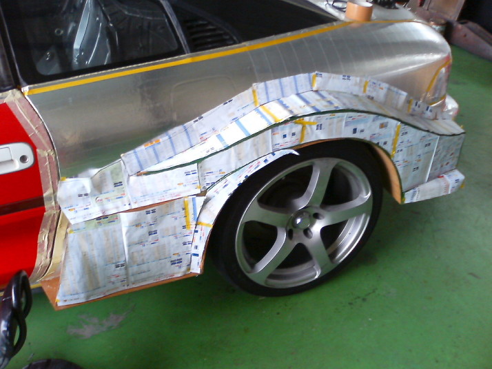 | 「オーバーレイ」という外側からガラスマットを貼り付けて 硬化後、表面を削ったりパテで均したりして仕上げる方法なので なるべくデコボコになり難いように型紙を作ります。 作業開始時はアルミテープで覆ってあるリアフェンダー全面にFRPで作る予定でしたが、あまりに材料が無駄なだけでなく、重くもなるのでブリスター部と取付け代のみを作る事にしました。 |