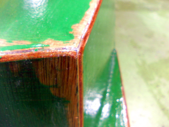 | 表側の角ばった部分をサンドペーパーやヤスリ等で面取りします。 この際接着部が剥がれてしまわないように多めにボンドを盛り付けてあったわけです。 角のRが10R欲しい場合、この時点で10R確保出来なくても この後にFRPを貼り込んでいくとその肉厚分で丸みが大きくなるので5〜8R位になっていれば大丈夫でしょう(多分・・・) ところで表面の緑色ですが、これは他の作業中に余ってしまった型用ゲルコートとか樹脂をなんとなく捨てるのがもったいなくて塗ってしまっただけですので特に意味はありません。 |
