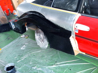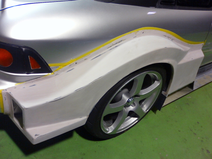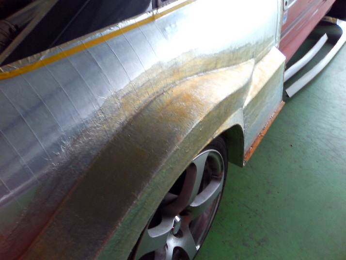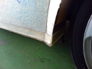 | それをフェンダー下部に両面テープ等で固定。 5cmばかり垂直に立ち上げを作ってあるので、その立ち上げ部分にフェンダーの2層目を積層して接着してしまいます。 あとはフェンダーの積層が終わって車から取り外した後に下部内側に追加積層してしまえばオッケーですね(^^)y |