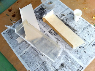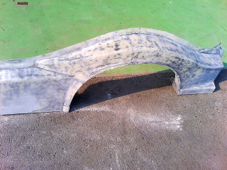 | フェンダーの下部は上向きに積層しなければならない上、 直角の場所に貼らなければならないのでちょっと困難です。 そこで下部を別部品として先に作ってしまうことにしました。 「表面に塗装されている化粧板」でフェンダー下部の「簡易雌型」を製作し、内側に#450マットを1プライ貼って脱型。 |